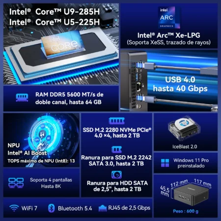 - Diseño futurista y compacto (solo 5,74 L) – Chasis metálico con iluminación RGB, pantalla frontal de monitoreo y estética impresionante.