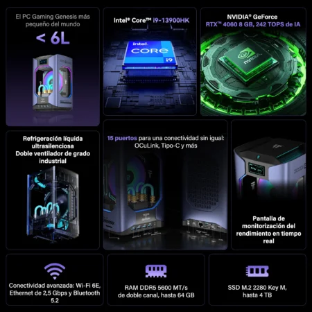 - Soporte para GPU externa vía OCuLink + USB4 – Expansión avanzada con 15 puertos, incluyendo HDMI, USB-C, lector de tarjetas SD y más.